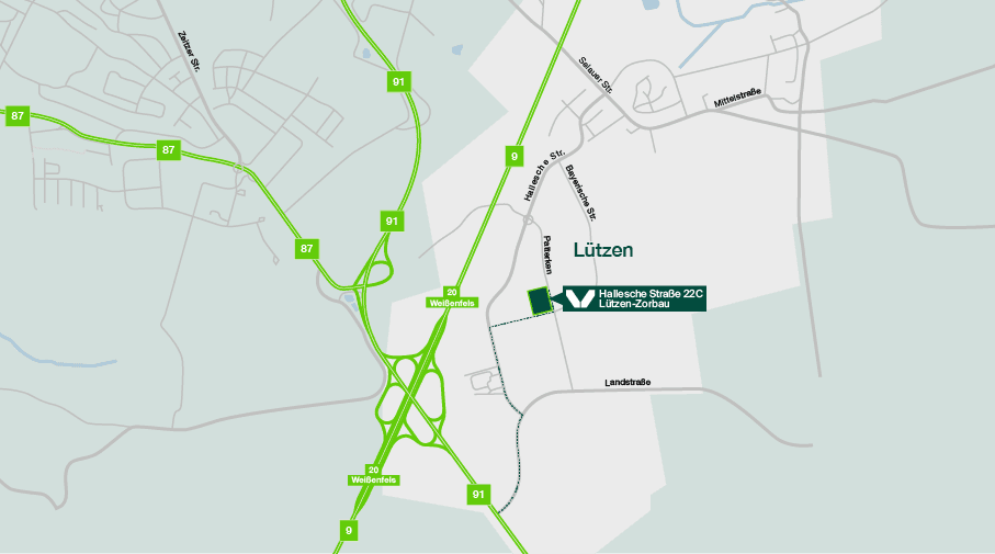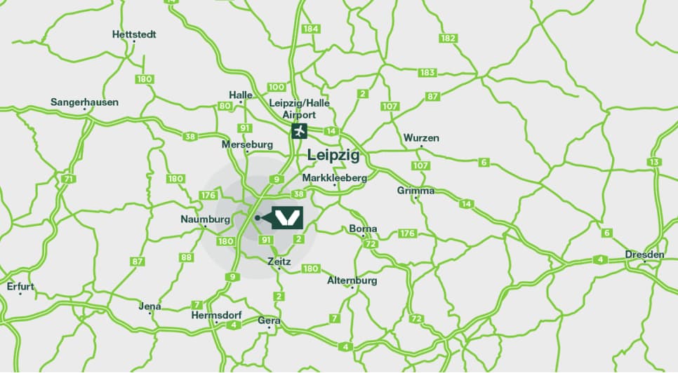 Das Objekt ist durch seine Lage optimal an das deutsche Straßennetz angebunden. Die Liegenschaft mit eigener Zufahrt über die Hallesche Straße befindet sich in der Nähe der A9, die Berlin und München verbindet. Über das neun Kilometer nördlich gelegene Autobahnkreuz Rippachtal besteht zudem Anschluss an die A38. Von dort aus ist der Süden Leipzigs schnell erreichbar. 30 Minuten südlich des Standorts liegt die A4, über die sowohl die Stadt Dresden im Osten als auch Bad Hersfeld im Westen zu erreichen ist. Ferner besteht Anbindung an die Landesgrenzen nach Polen und die Tschechische Republik. Im Norden befindet sich die A14 sowie die Städte Halle und Leipzig mit ihrem gemeinsamen Flughafen.